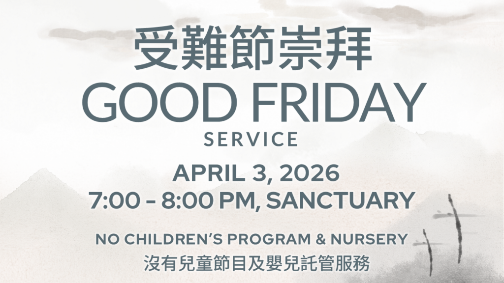 誠邀弟兄姊妹參加 4/3 (週五) , 7 – 8 pm在大堂舉行的受難節崇拜, 一同默想耶穌的犧牲及十字架改變生命的大能,並探索十字架如何在我們的生命中帶來自由、赦免、醫治與和解。歡迎攜帶家人與朋友一同紀念這特別時刻, 當晚不設托兒服務。